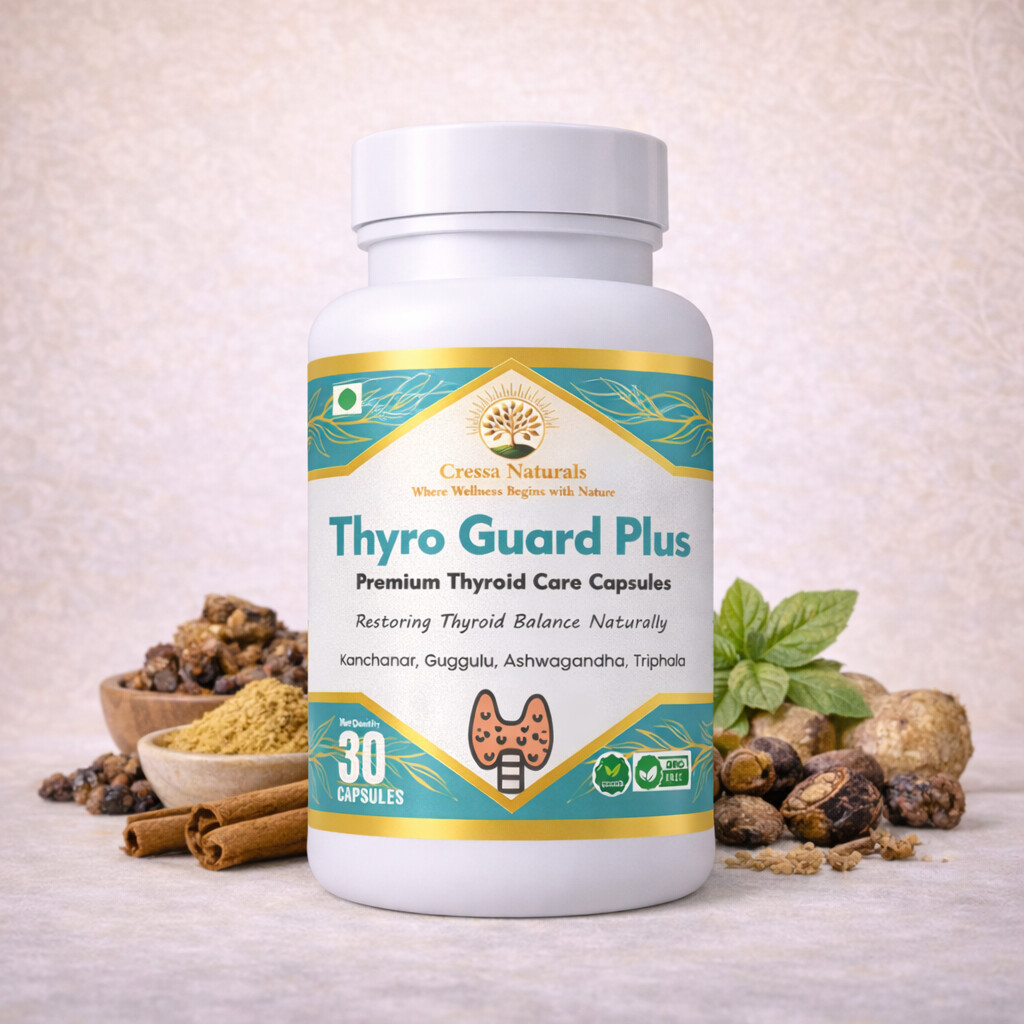 Thyro Guard Plus is a plant-based Ayurvedic dietary supplement formulated with traditional herbs to support healthy thyroid function and metabolic balance. It is designed to help manage thyroid-related imbalances, reduce glandular swelling, and support overall hormonal wellness naturally and safely.