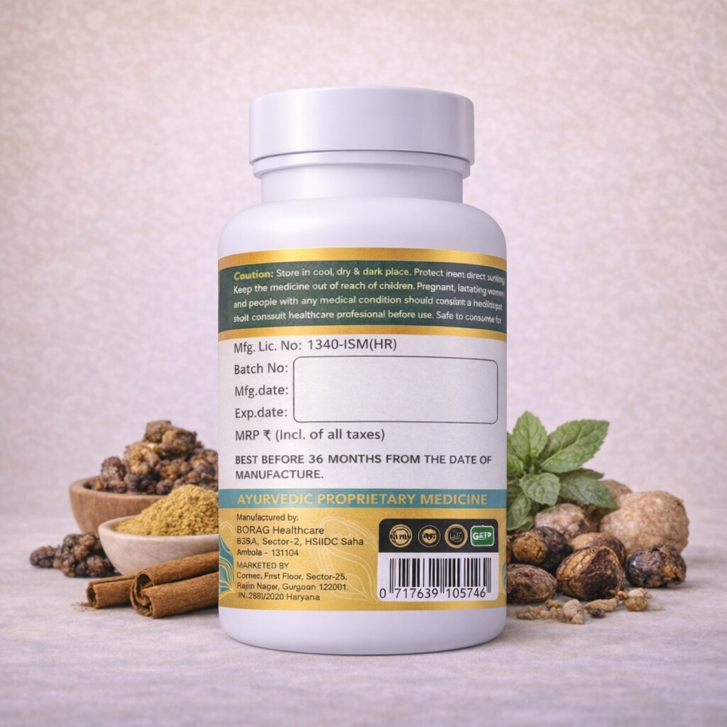 | Guggulu | Commiphora wightii | Gum-resin | 200 mg |